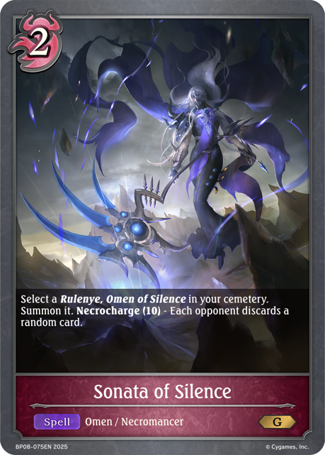Select a Rulenye, Omen of Silence in your cemetery. Summon it. Necrocharge (10) - Each opponent discards a random card.